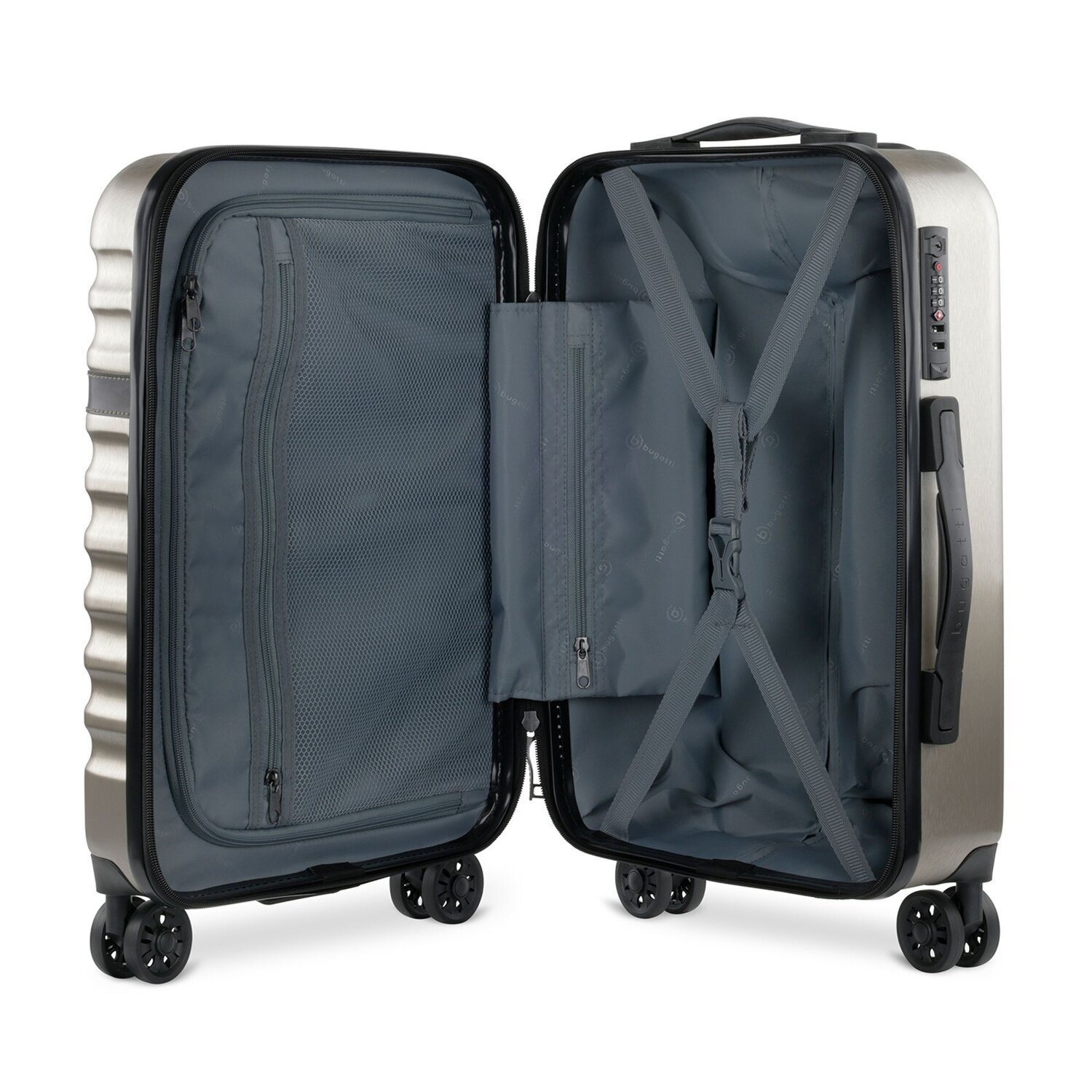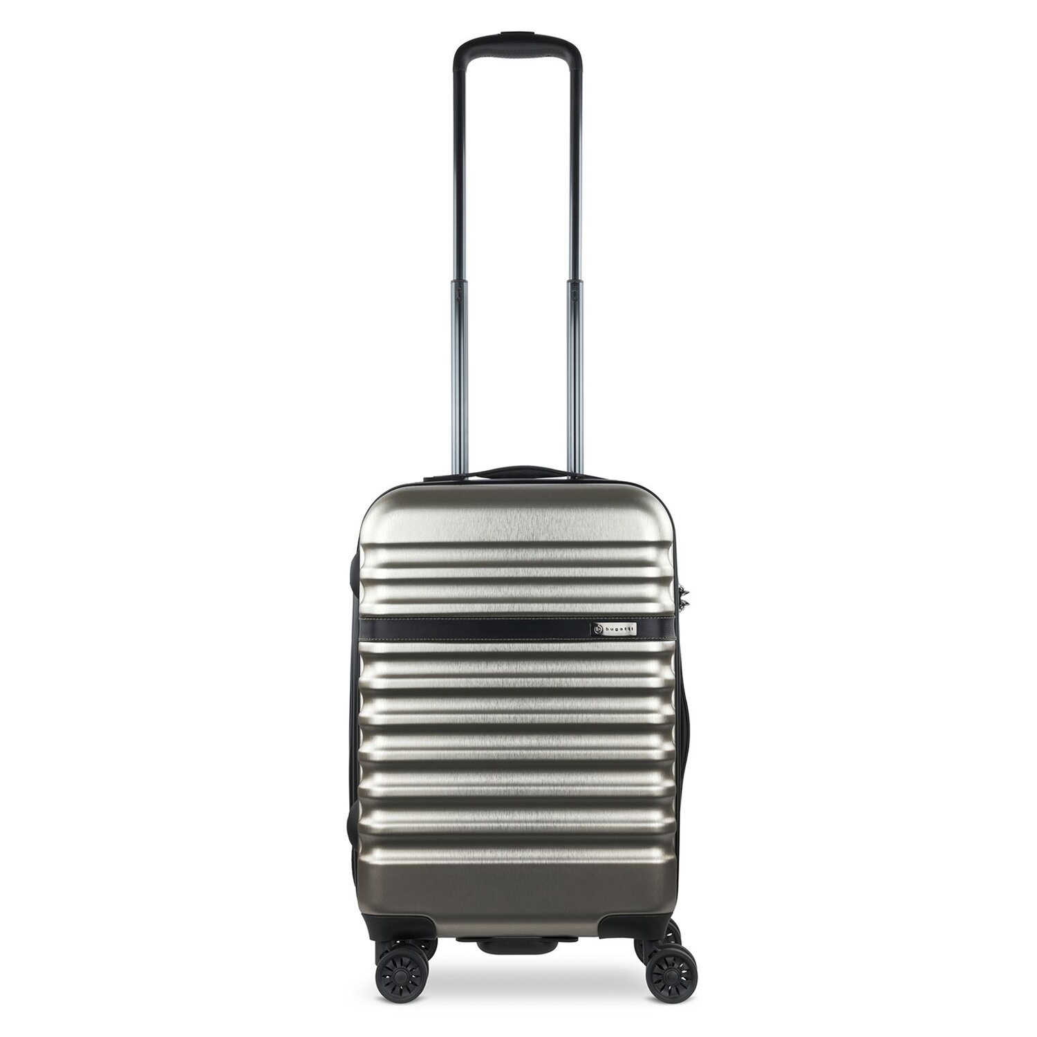 Luxuriöser Hartschalentrolley von Bugatti mit 4 Rollen und arretierbarem Teleskopgriff. Der Kabinentrolley überzeugt durch modernes Design, Stabilität und Funktionalität. Er verfügt über ein geräumiges Hauptfach mit Packriemen, ein großes Hemdenfach und zwei Netzfächer. Der perfekte Begleiter für die nächste Reise.
