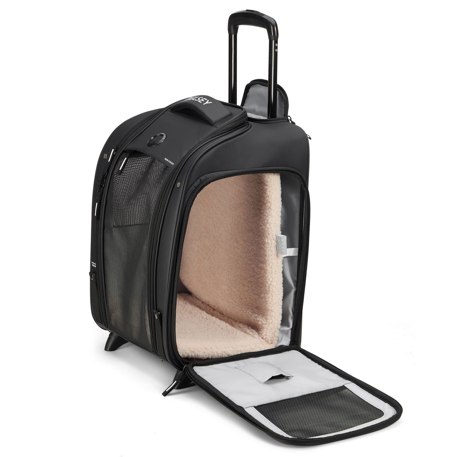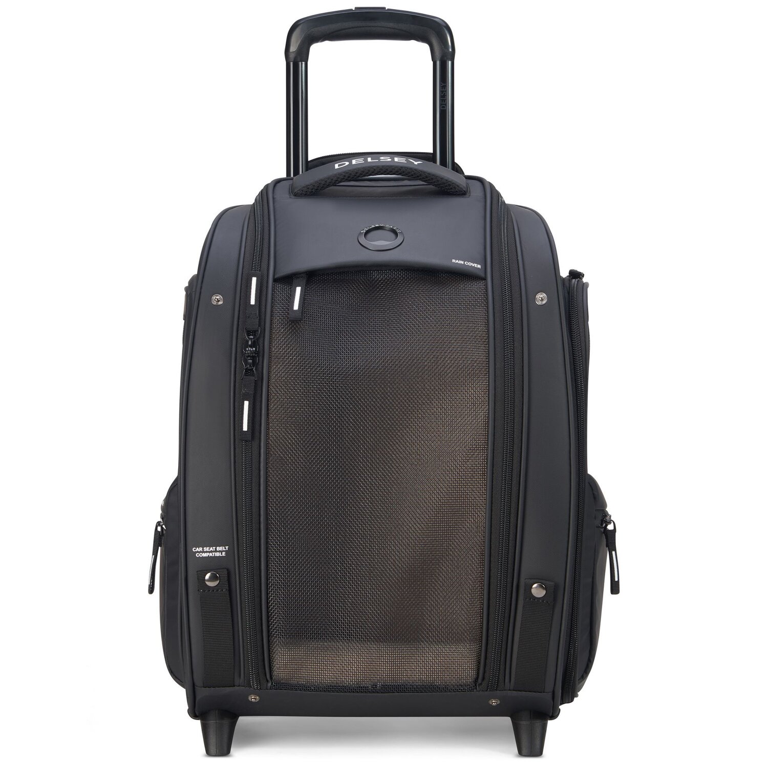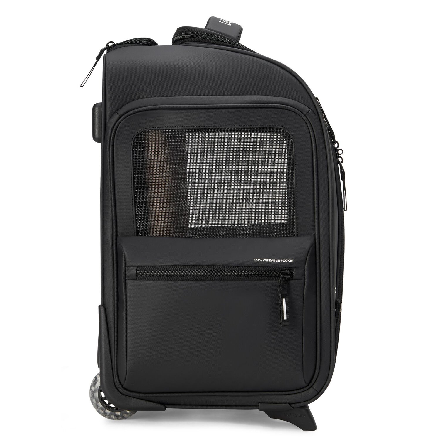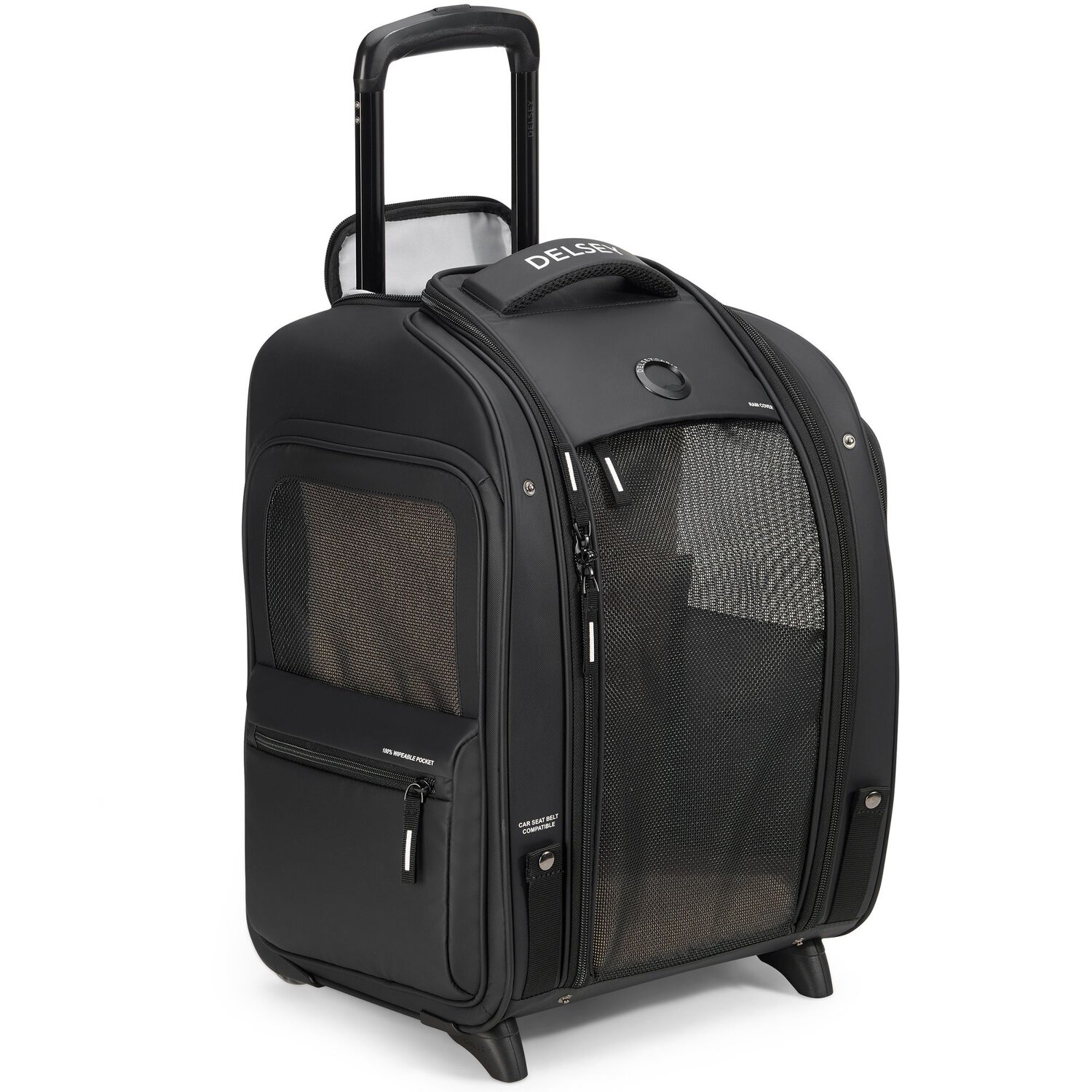 Stilvoller 2-Rollen Trolley der Marke Delsey in klassischem Design. Ausgelegt für den Transport von Kleintieren. Ausgestattet ist das Hauptfach mit einer bequemen Unterlage für ihr Haustier und ein Netz jeweils an beiden Seiten sowie vorne für eine gute Luftzirkulation. Sie können den Trolley entweder tragen oder dank arretierbarem Griff schieben.