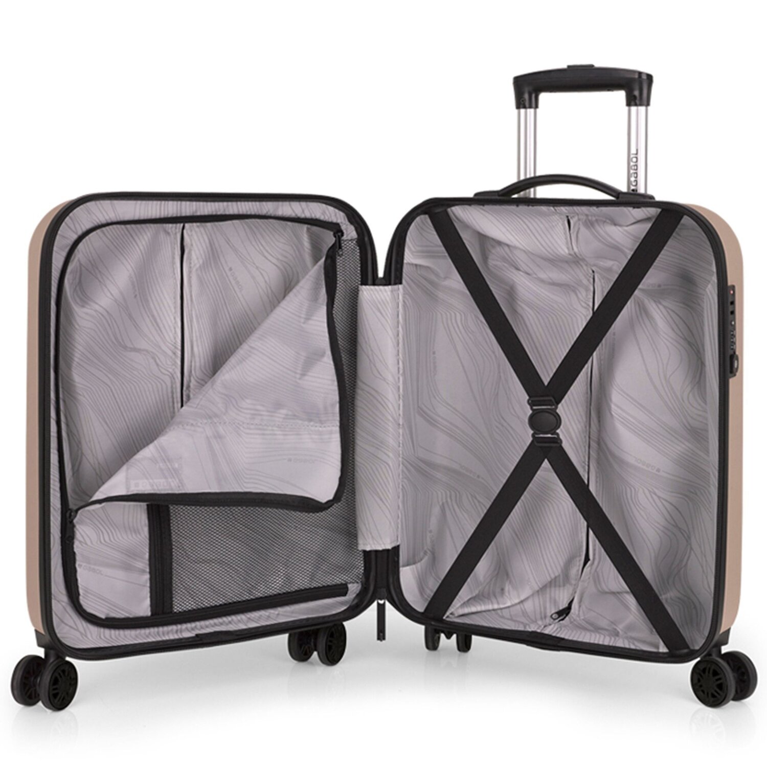 - Ausstattung: Wäschefach, Reißverschlussfach, Kreuzpackgurt, Dehnfalte, arretierbarer Griff
