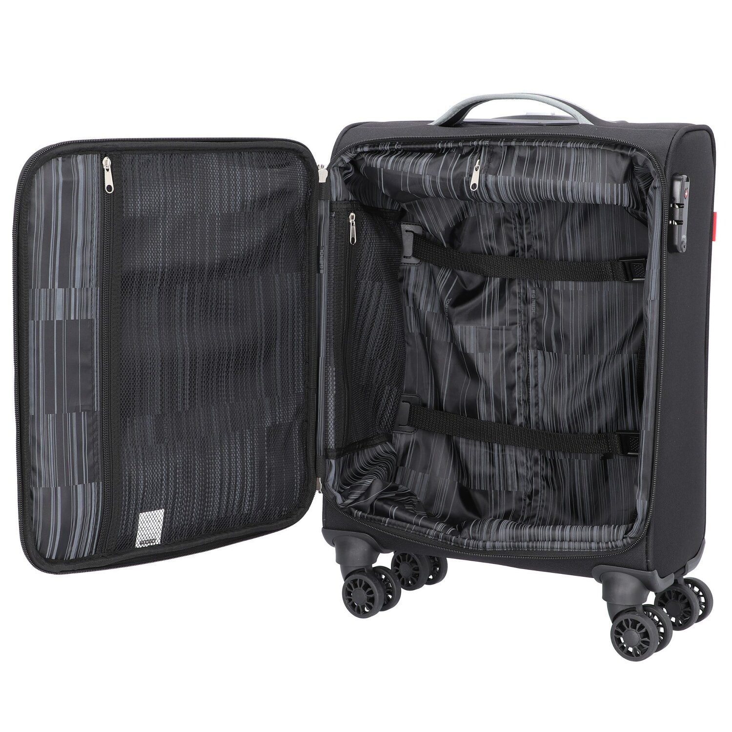 - Ausstattung: Tasche(n) innen, Tasche(n) außen, Reißverschlussfach, Netzfach, arretierbarer Griff