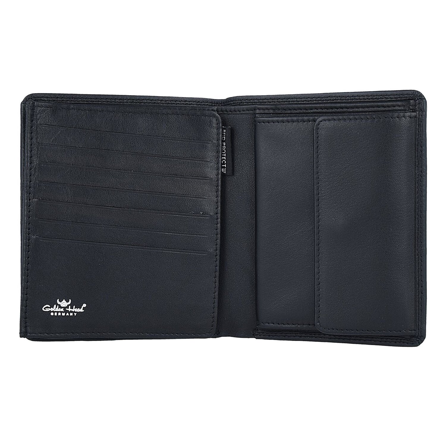 Angesagte Golden Head Geldbörse der Polo-Reihe aus hochwertigem Leder und mit RFID-Schutz. Die Scheintasche bietet viel Stauraum für Ihre Geldscheine, Kreditkarten, Coupons oder Einkaufszettel.
