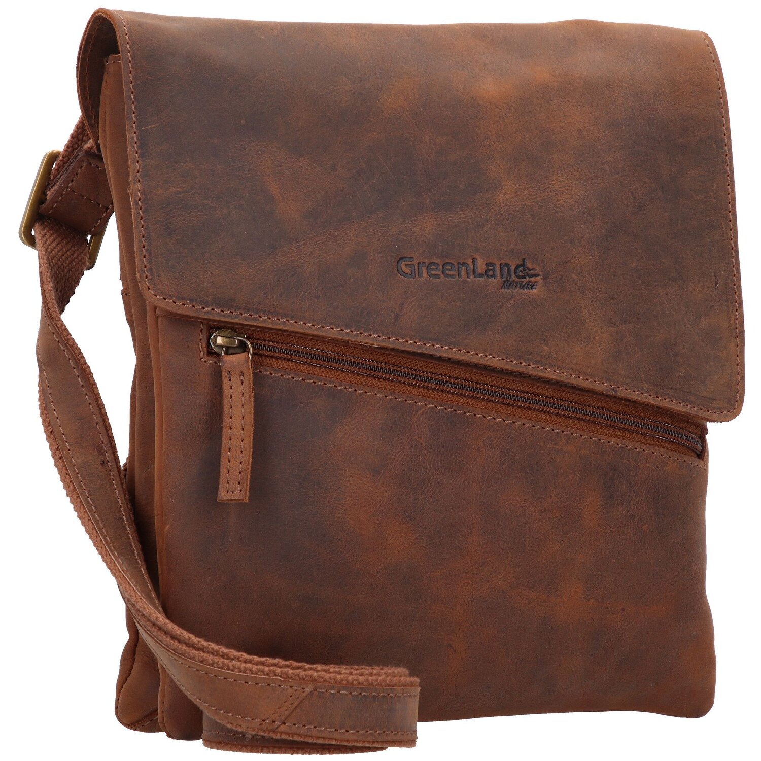 Umhängetasche von Greenland Nature mit verstellbarem Umhängeriemen. Die praktische Tasche aus robustem Leder verfügt über ein großes Hauptfach und weitere Nebenfächer für Smartphone, Wertsachen und anderes.