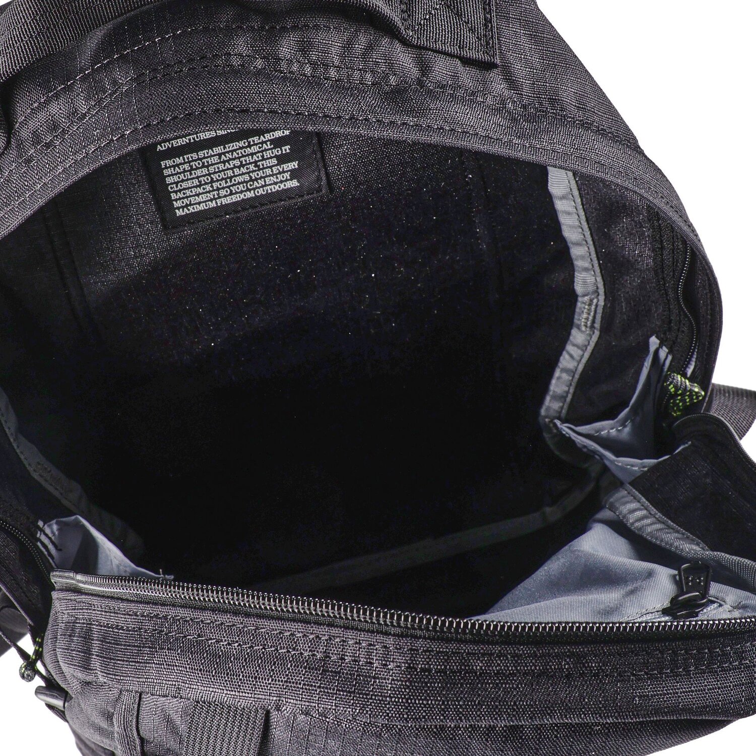 - Ausstattung: Rückenpolsterung, Reißverschlussfach, Kompressionsriemen, Brustgurt, Beckengurt, Ausrüstungsschlaufe