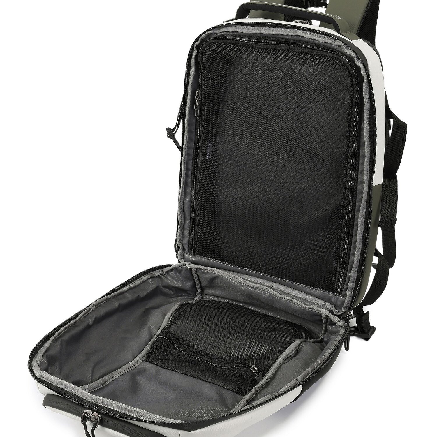 - Ausstattung: Wäschefach, Tasche(n) außen, Reißverschlussfach, Kompressionsriemen, Brustgurt, auf Trolley steckbar