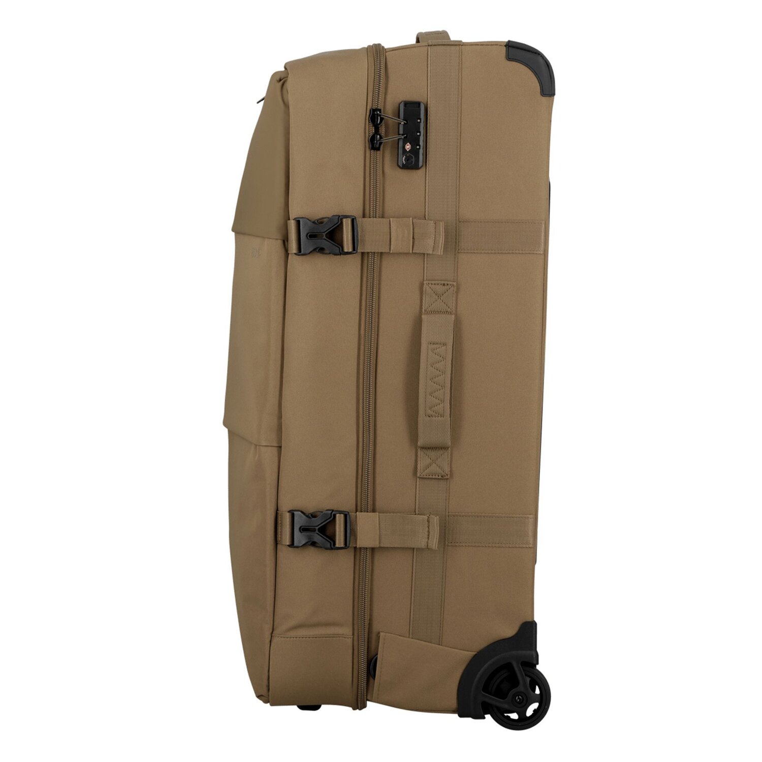 - Ausstattung: Wäschefach, Rucksackfunktion, Reißverschlussfach, Netzfach, Kompressionsriemen, arretierbarer Griff