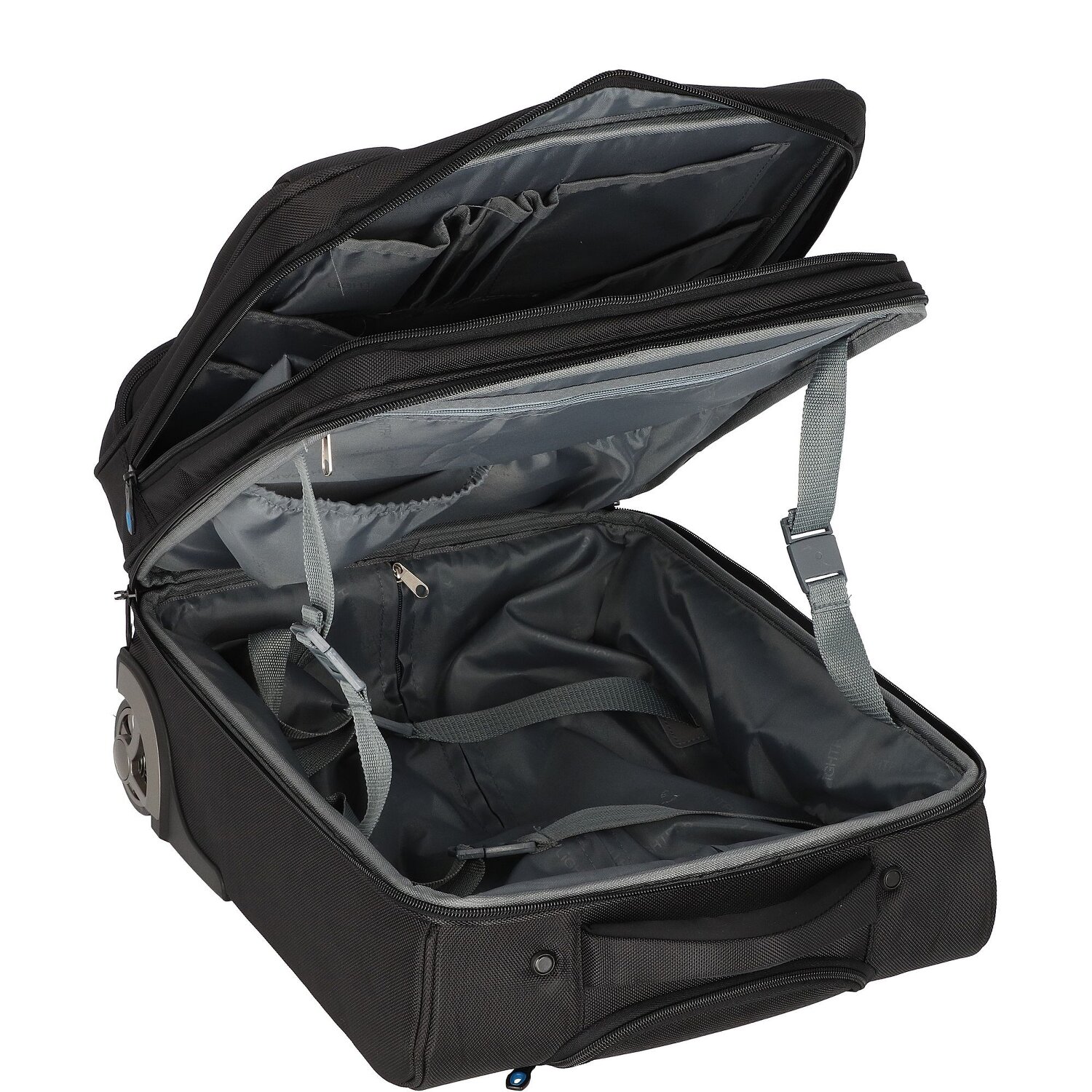 - Ausstattung: Tasche(n) innen, Tasche(n) außen, Reißverschlussfach, Handyfach, auf Trolley steckbar