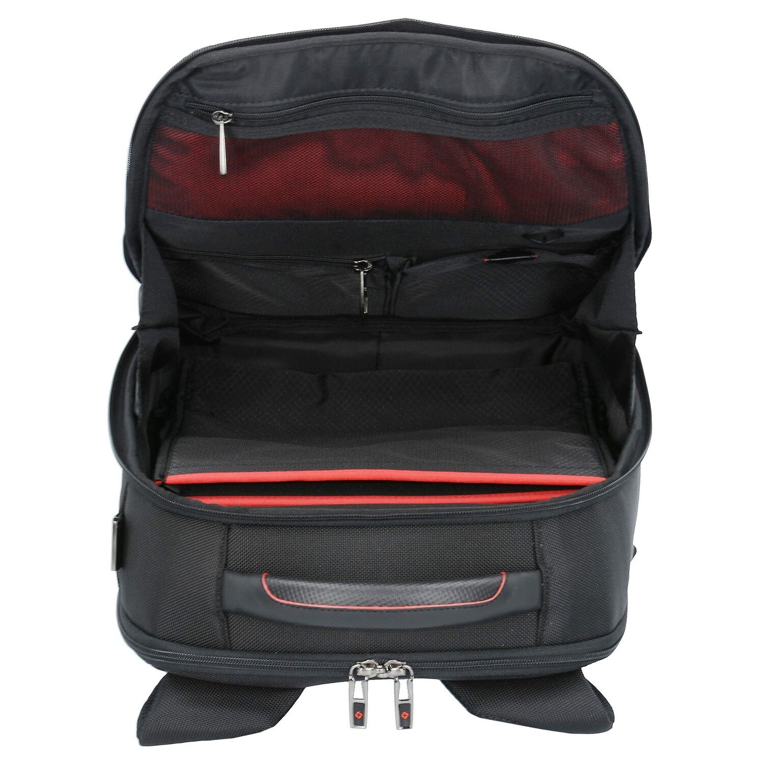 - Ausstattung: Tasche(n) innen, Tasche(n) außen, Rückenpolsterung, Reißverschlussfach, Platz für großen Aktenordner, Handyfach, auf Trolley steckbar