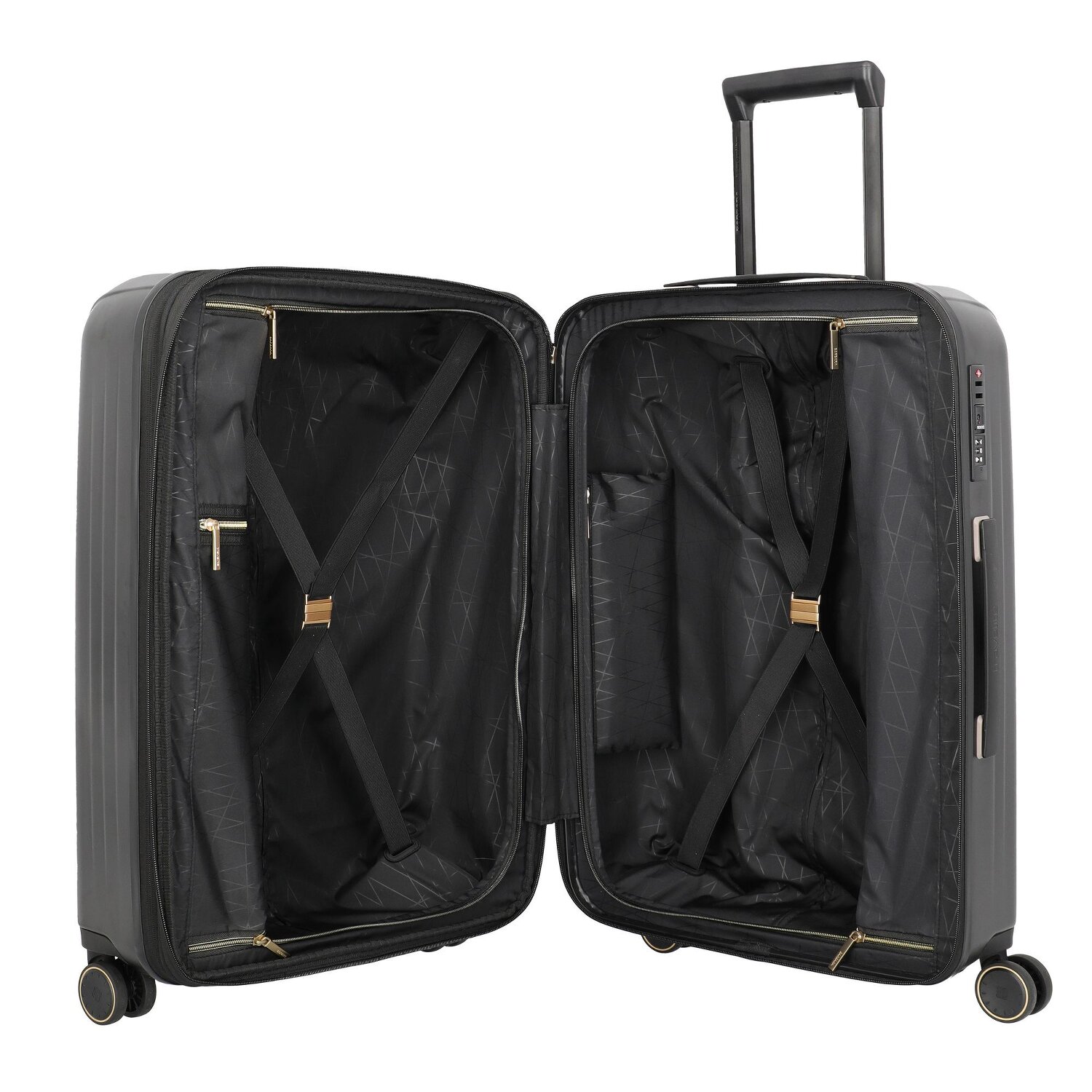 - Ausstattung: Wäschefach, Reißverschlussfach, Kreuzpackgurt, Herausnehmbare Tasche, Dehnfalte, arretierbarer Griff
