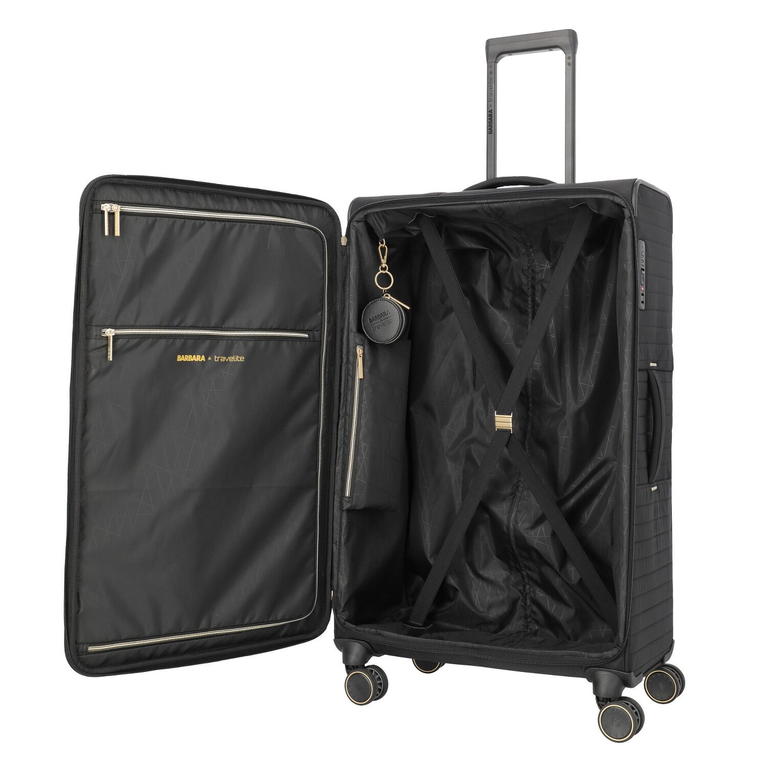 - Ausstattung: Wäschefach, Tasche(n) außen, Reißverschlussfach, Kreuzpackgurt, arretierbarer Griff