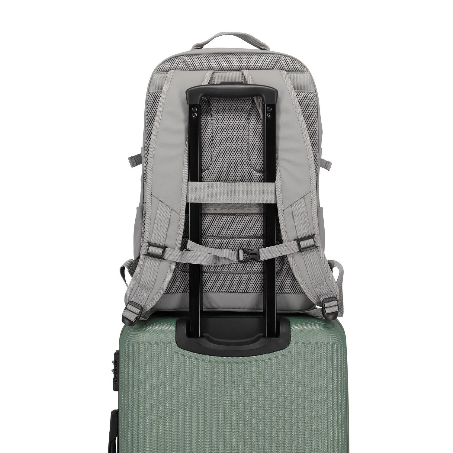 - Ausstattung: Tasche(n) innen, Tasche(n) außen, Rückenpolsterung, Reißverschlussfach, Netzfach, Geheimfach, auf Trolley steckbar