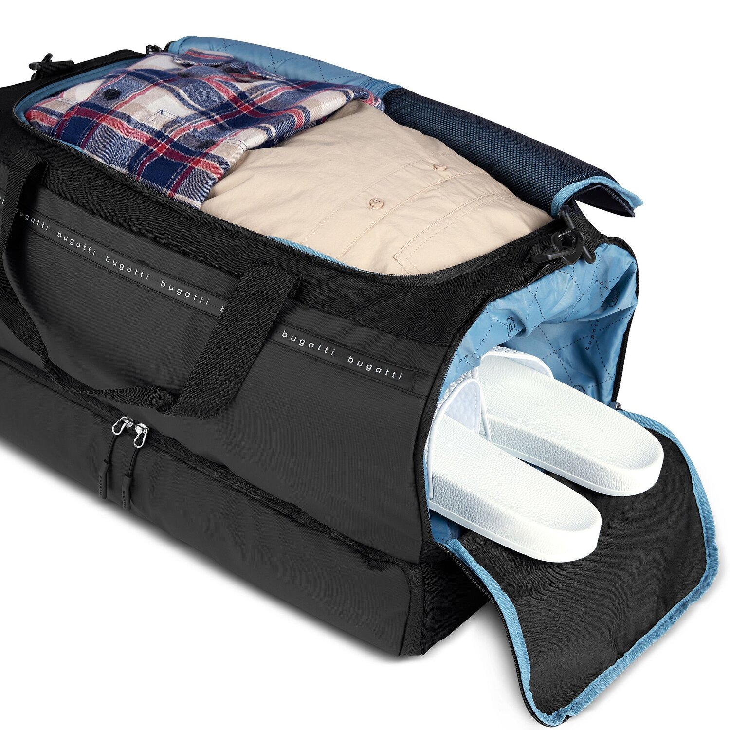 Bereit für neue Abenteuer? Die beeindruckende Reisetasche Weekender aus der Blanc Delight Serie von Bugatti wartet nur darauf, gemeinsam die Welt zu entdecken. Ausgestattet mit einer cleveren Kombination aus Netzfach, Außen- und Innentaschen wird jedes Packen zum Traum. Selbst die schmutzigen Schuhe werden in dem mitgelieferten Schuhbeutel stets getrennt gehalten. Das Polyurethan Material hüllt all dies in einer widerstandsfähigen und stilvollen Hülle ein, die atemberaubend aussieht und sich noch dazu angenehm anfühlt. Dank der Rucksackfunktion und dem Tragegriff lässt sich der Weekender einfach transportieren. Ein absolutes Highlight für jeden Weltenbummler - eine Bugatti Reisetasche, die für unbegrenzte Möglichkeiten steht.